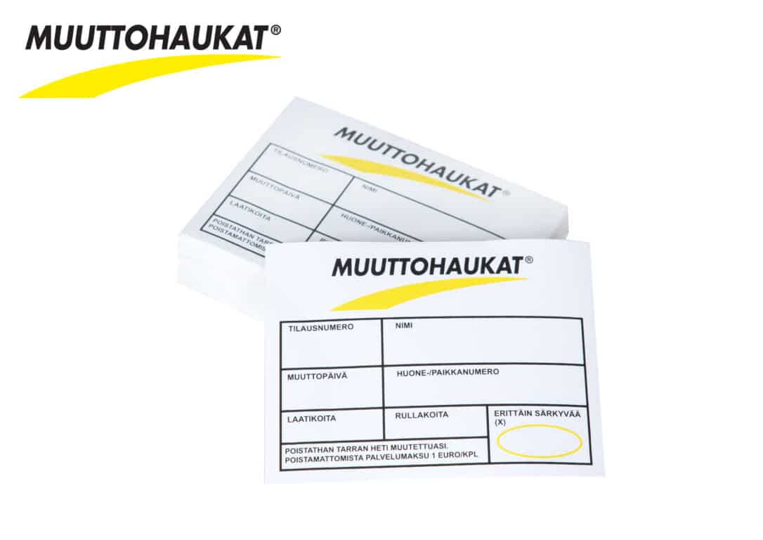 Merkintätarrojen avulla saat tavarat kerralla oikeaan huoneeseen. Merkintä tarrojen avulla helpottaa tavaroiden löytymistä muuton aikana ja sen jälkeen.